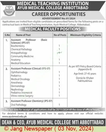 Ayub Medical College seeks qualified individuals who have a solid academic background and clinical expertise in medicine. The college values professionals with a commitment to teaching, research, and patient care. Here are the key eligibility criteria for the position: